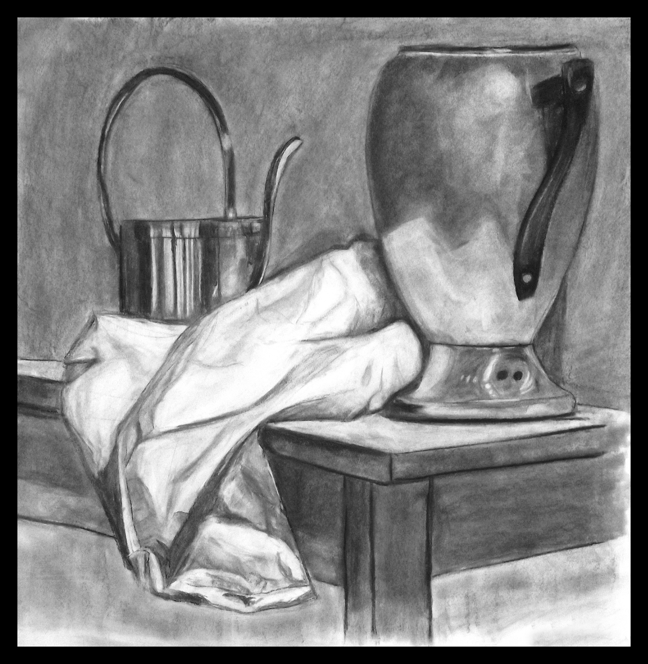- A collection of materials to use for still life arrangements such as a new model skeleton, tea kettles, small white, metal, and colored objects.