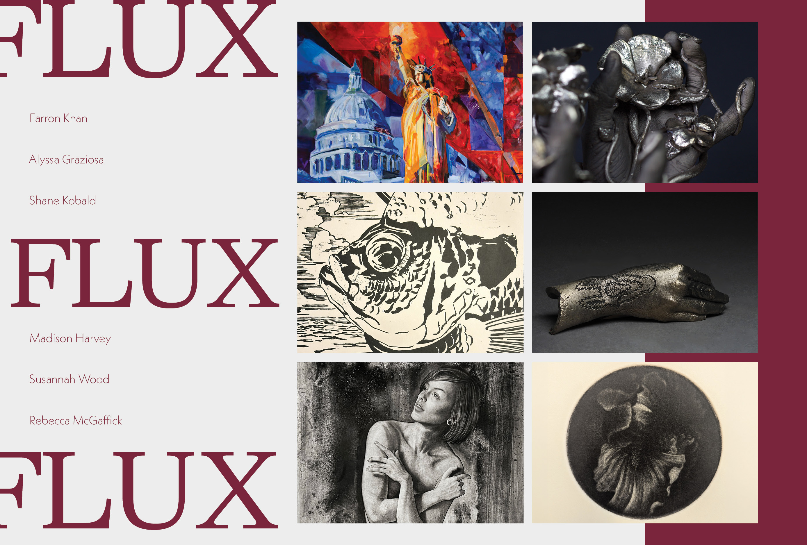 The CMU 437CO Art Gallery is pleased to announce our newest show, Flux, with the second group of our 2026 Senior BFA candidates Alyssa Graziosa, Farron Khan, Madison Harvey, Rebecca McGaffick, Shane Kobald, & Susannah Wood.