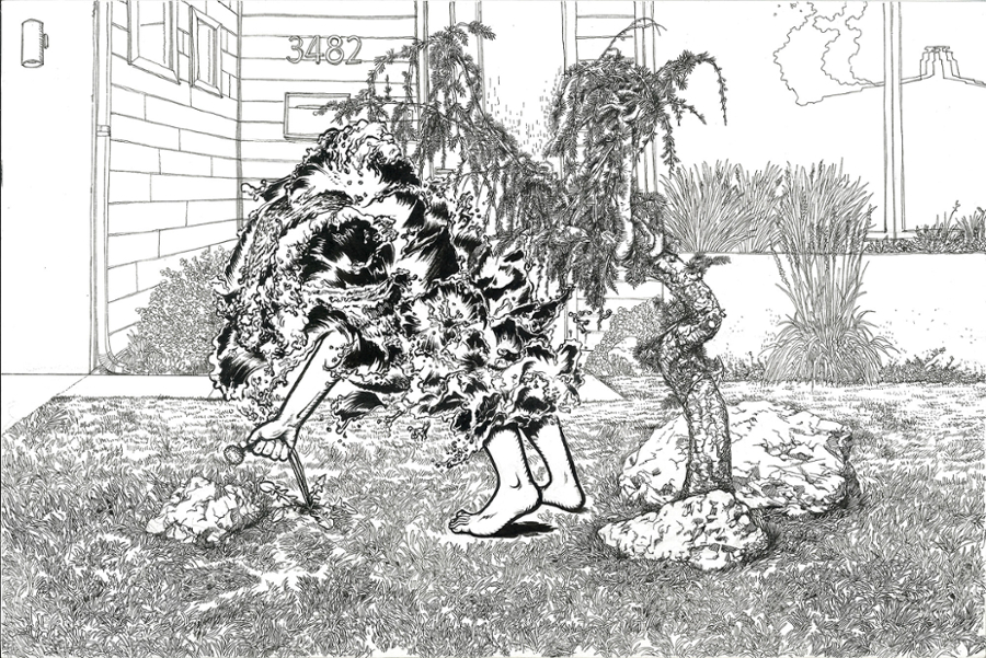 Prints, paintings, and ceramic, cast metal and wood sculptures by Darian Green, Zach Drake, Eric Nestle, Cameron Williams and Marcus Fingerlin.