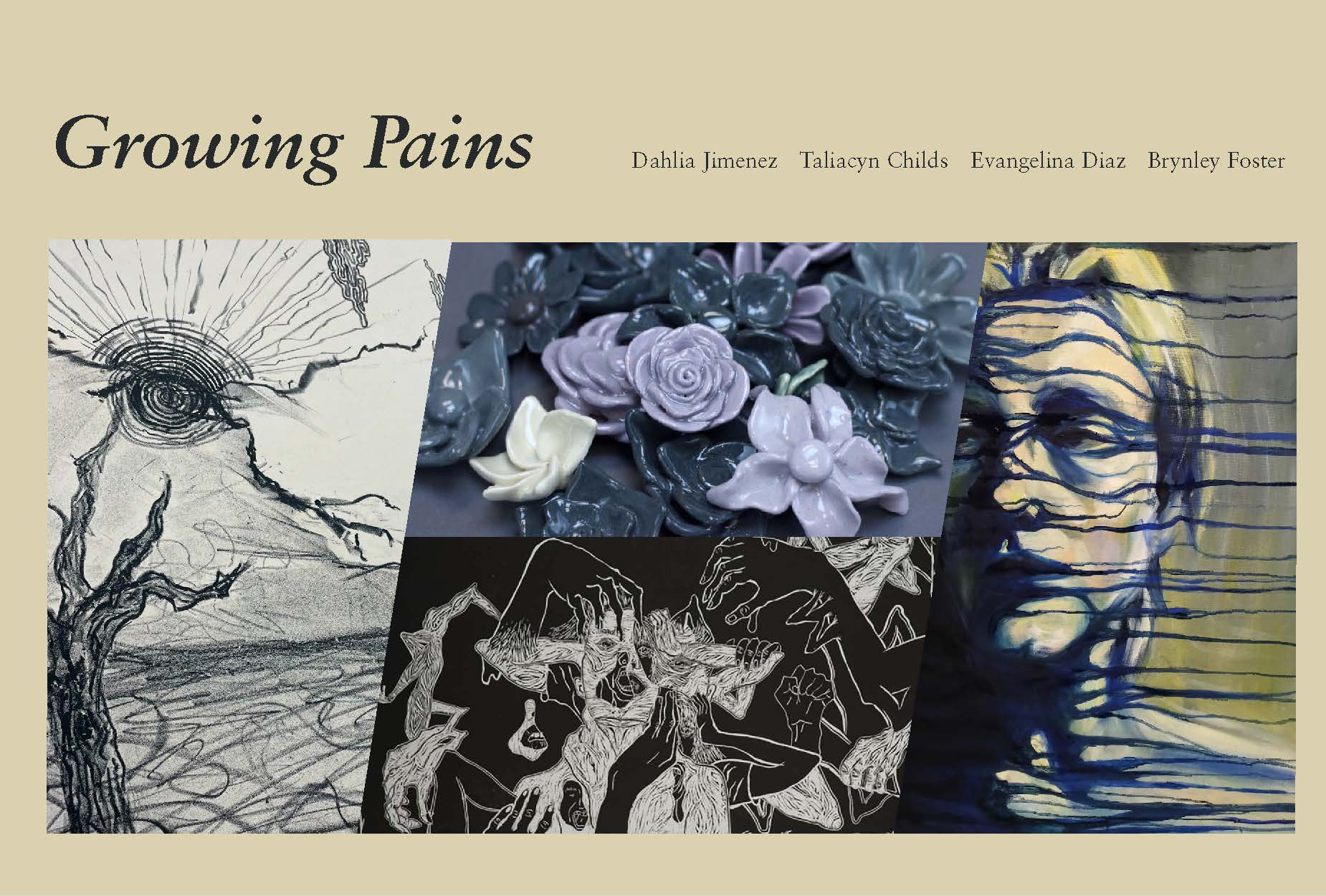 BFA Senior Exhibition: Rooted featuring artwork by BFA Studio Art senior's Cory Crawford, Brian Marques, Krysten Reyes, and Rebecca Tigert.