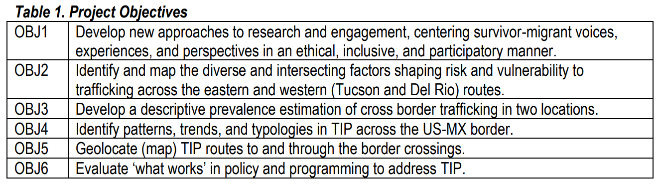 Disaggregated Estimates of Prevalence in Trafficking of Humans (DEPTH) aims to generate a comprehensive mapping of trafficking in persons (TIP) prevalence and experiences among populations crossing the United States and Mexico border and provide key actors with context-specific, data-driven guidance for improved prevention and response. This is a research project funded by the National Institute of Justice under the United States Department of Justice.