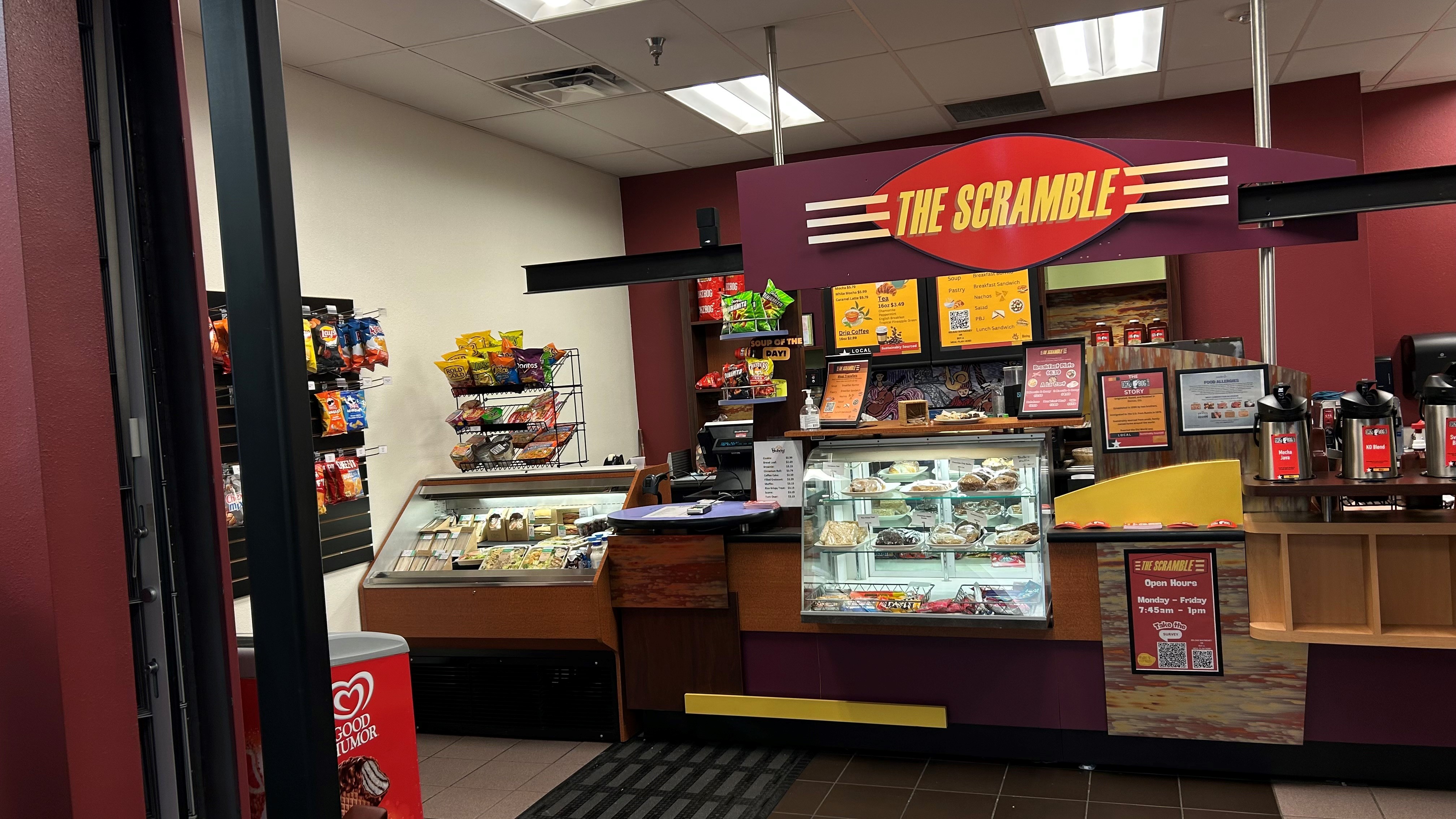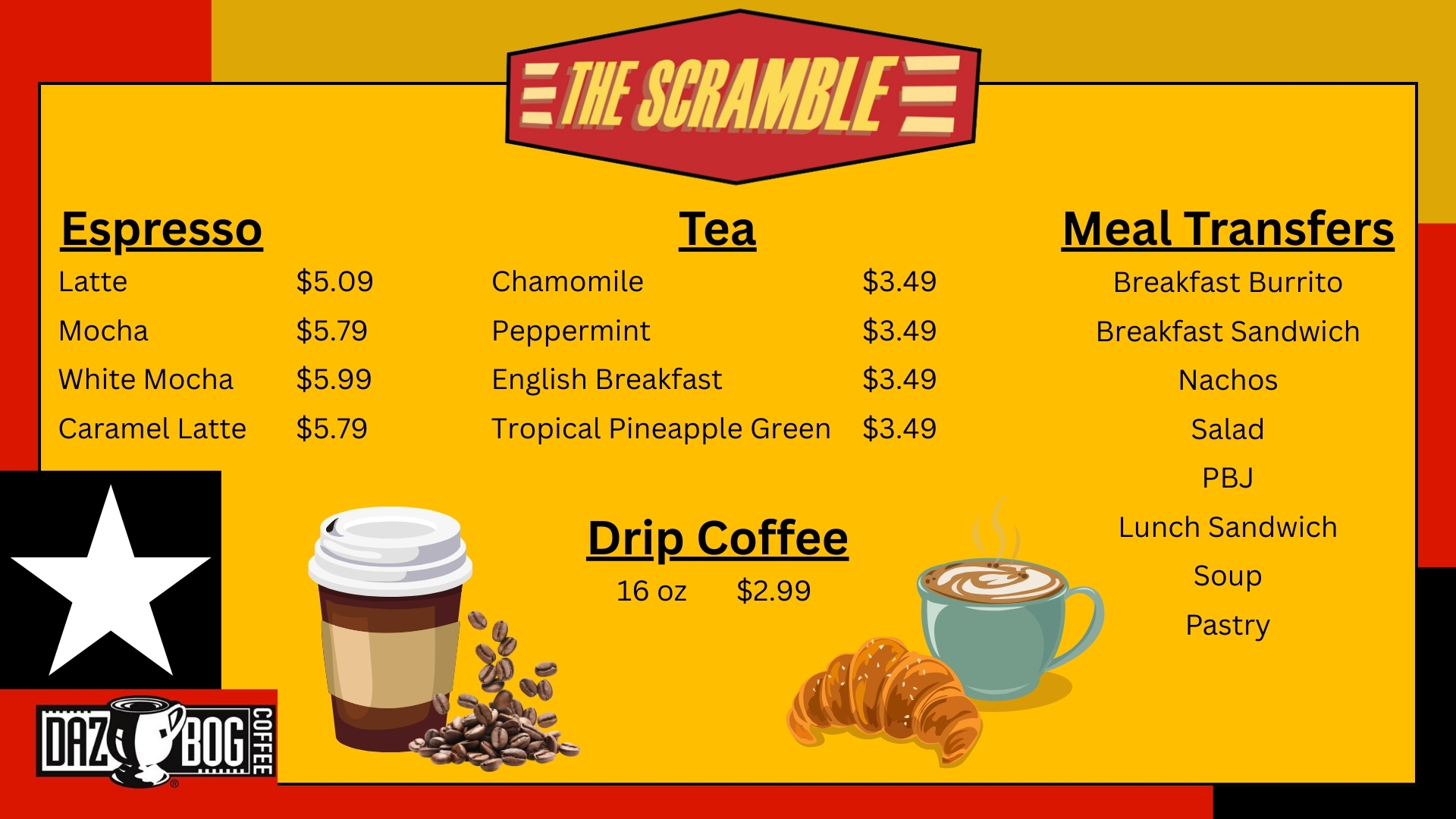The Scramble is located at CMU Tech and features espresso, drip coffee, tea, and Simply To Go options. Also sample some of the fresh made soups, salads and bakery items that reflect the seasons.