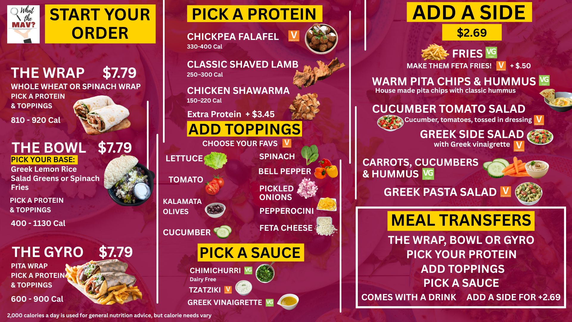 Enjoy a Mediterranean style Gyro, Bowl or Wrap at What the MAV? now with new side options like Feta Fries, Cucumber Tomato Salad and Greek Pasta Salad!