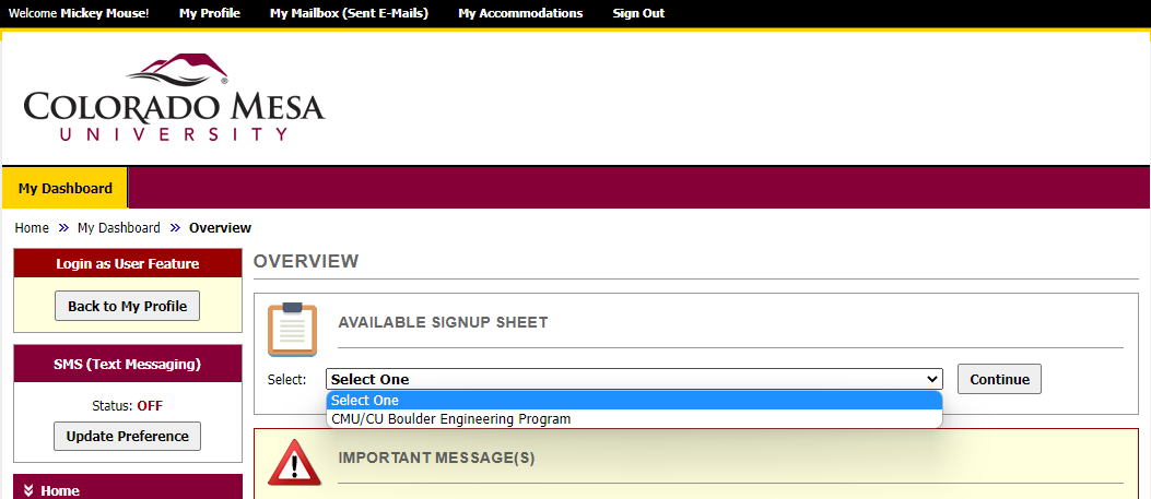 At the top of your landing page in AIM, is an [Bold:"Available Signup Sheet"]. Select the CMU/CU Boulder Engineering Program option and select Signup Now. This will need to be done each semester you wish to have accommodations sent to CU Boulder courses. Completing this Signup will notify EAS to begin adding your CU Boulder courses to your AIM profile.