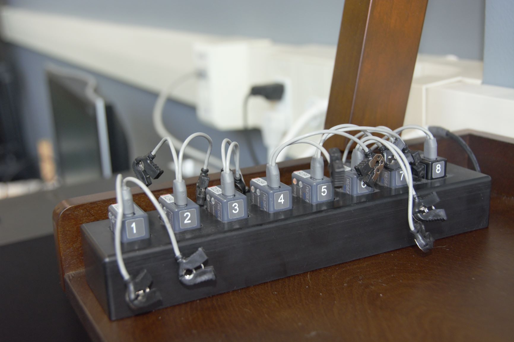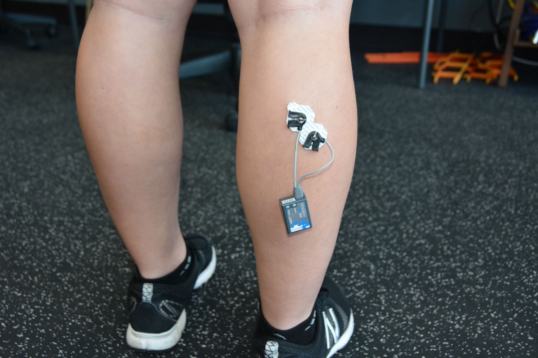 Electromyography (EMG) is an analysis technique used to evaluate and record the electrical activity produced by skeletal muscles. These electrical signals can be used to detect medical abnormalities, activation status, muscle motor unit recruitment order, or to analyze the biomechanics of a given movement. This analysis is performed via small transmitters connected to electrodes placed directly to an individual's bare skin at the center of the muscle belly being analyzed.