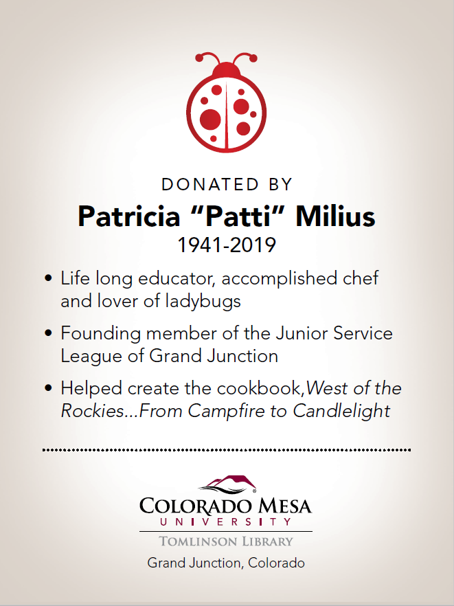 In January 2020, Patricia “Patti” Milius officially donated her much-loved cookbook collection to Colorado Mesa University’s Tomlinson Library. Totaling over 2,500 items dating back to 1860, the collection spans regions from the American Southwest to French Cuisine; bridges all manner of baking, from crepes to cookies; and figures specialized titles from the collectible to the Colorado-centric. This collection also contains a wealth of community-created cookbooks with which she felt a special connection, as a founding member of the Junior Service League of Grand Junction, through which she worked on the West of the Rockies…From Campfire to Candlelight cookbook. Tomlinson Library is thrilled to be the recipient of this exciting donation, particularly as we share the donor’s love for and investment in the culinary arts within our Grand Valley.
