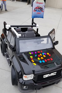 Another team added a magnetic sheet to the hood of their car so that they could stick magnetic numbers and letters to it. Their assigned child has autism and loves numbers and letters, so they incorporated those into the car to entice the child to want to ride in it.