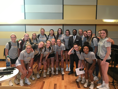 In addition to community members, the CMU Volleyball Team attended as a team and occupied the entire front row of the recital hall. Their seating position was meant to demonstrate unity and to establish a theme for their upcoming season.