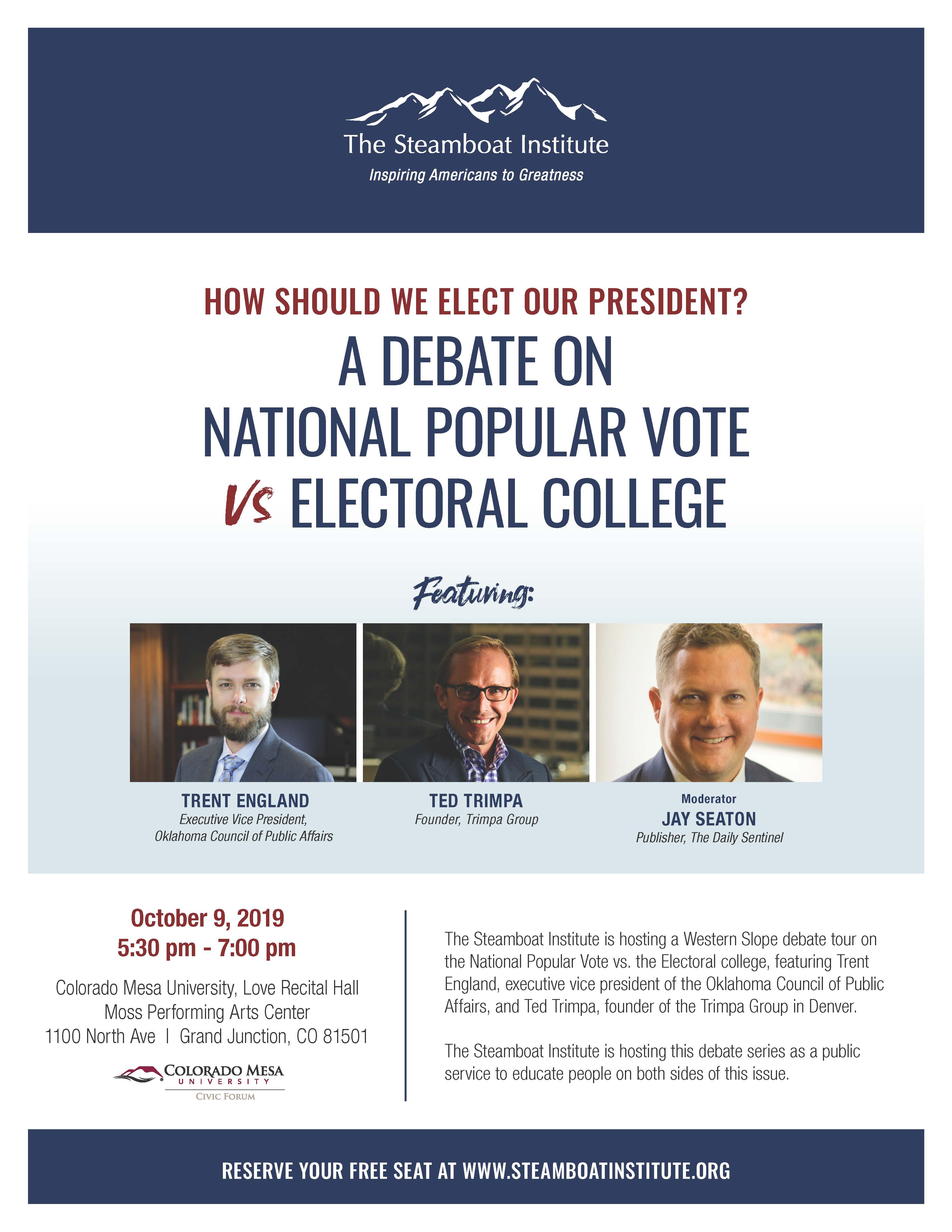 Colorado Mesa University’s ongoing effort to create hands-on civic engagement opportunities for students and the community will take the form of policy debate on Wednesday, October 9 from 5:30 to 7pm in Love Recital hall at CMU. The debate is part of the Steamboat Institute’s Campus Liberty Tour and is titled How Should We Elect Our President?
