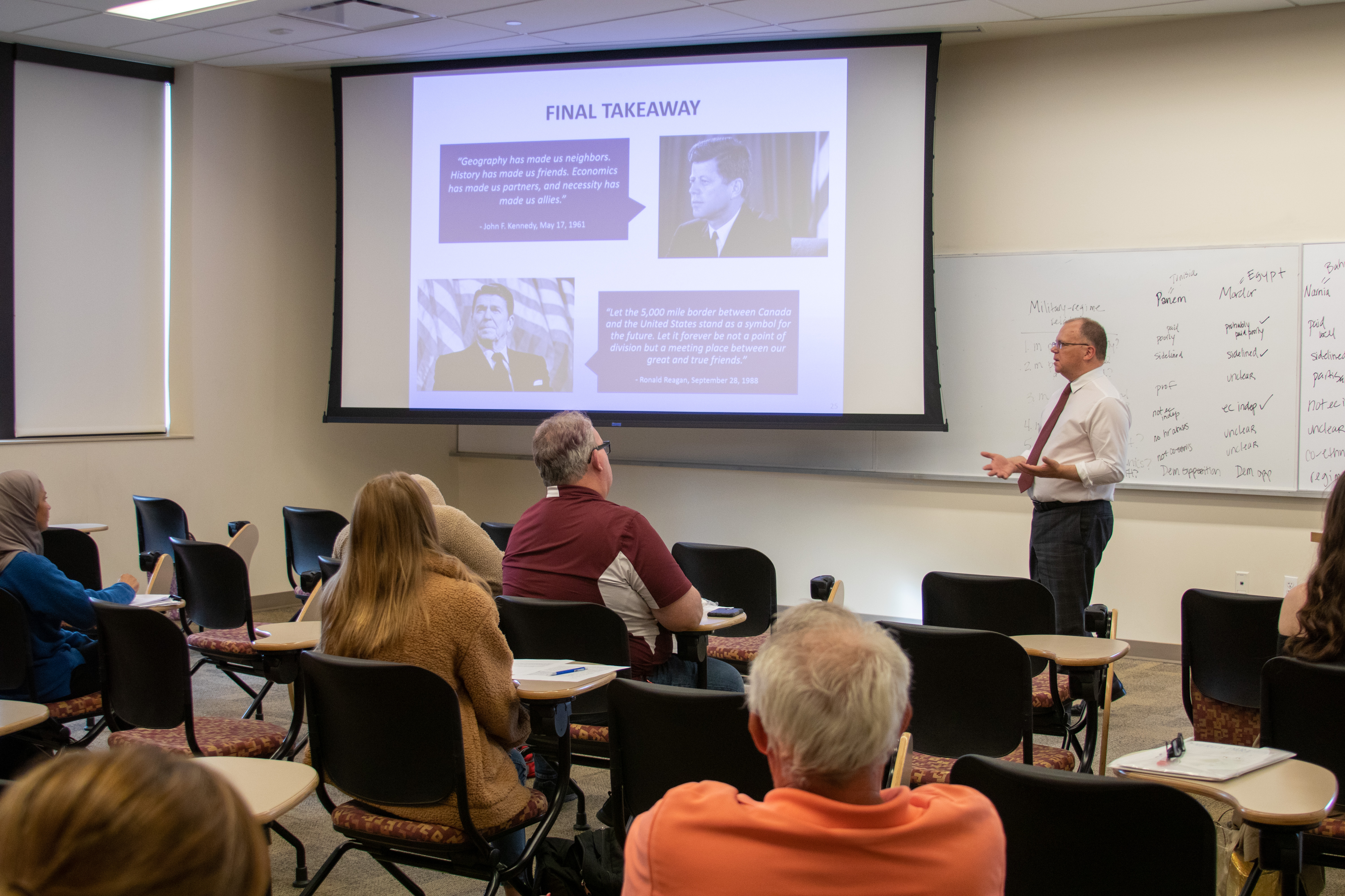 The range of topics covered by Lessard were diverse, ranging from timber and oil and natural gas to manufacturing, tourism and military cooperation. The Consul General outlined that cooperation between Canada and the United States represented one of the strongest and most continentally significant bi-lateral relationships in the world today. Lessard also noted Canada's near universal agreement that climate change is an issue that must be address but that there there are notable differences between the countries ongoing policies around how to accomplish climate goals. Despite some differing opinions the Consuls' message focused primarily on Canadian and U.S. shared objectives.
