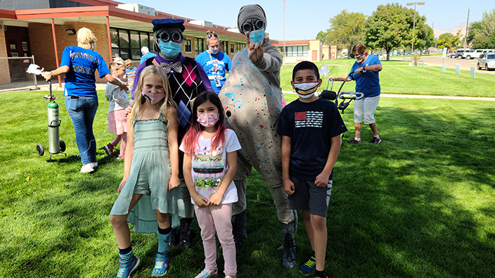 Two actors from the cast of Colorado Mesa University's musical Naked Mole Rat Gets Dressed: the Rock Experience were at Fruitvale on Friday, September 24. Murphy Baker and Ryan Heinsheimer were in full mole rat costume and character and had just completed a special surprise appearance with a third-grade class. Reading outside in the school yard, they were also joined by students with special needs. The actors read and performed the Mo Willems children's book that inspired the CMU musical. Having completed their visit, Baker and Heinsheimer made their way back to the parking lot when their progress was interrupted by the voice of a young girl.
