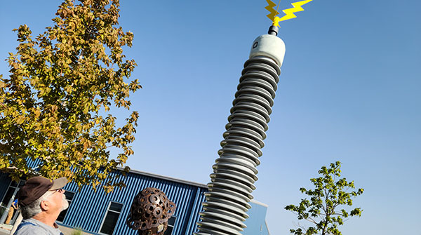 The anthropomorphic, tin-man figure stares up at a lightning bolt in wonder. The lightning bolt and human figure are connected through the protective buffer of a giant insulator. The insulator is a bridge between the natural raw power of electricity and the people who use it in homes, businesses and universities. Within the sculpture, the metallic line worker is staring at the lightning bolt assessing what challenges must be overcome to harness its power. This basic assessment is the same one conducted each day by electric lineworkers.