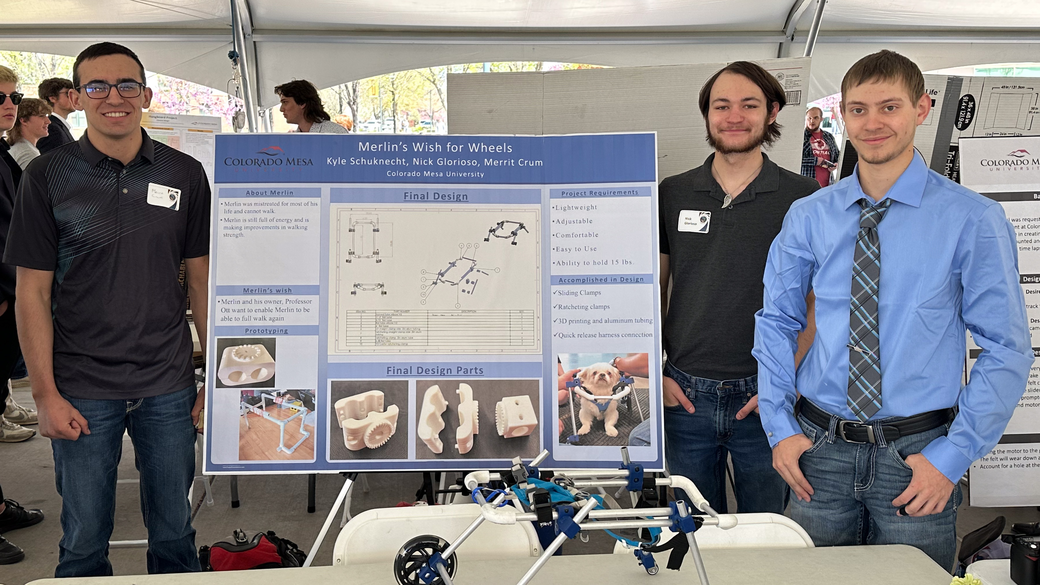 Lucky for Merlin, Jenna’s stepfather, CMU Associate Professor of Statistics Richard Ott, PhD, felt compelled to help and enlisted the assistance of three CMU junior engineering students to build him a wheelchair.