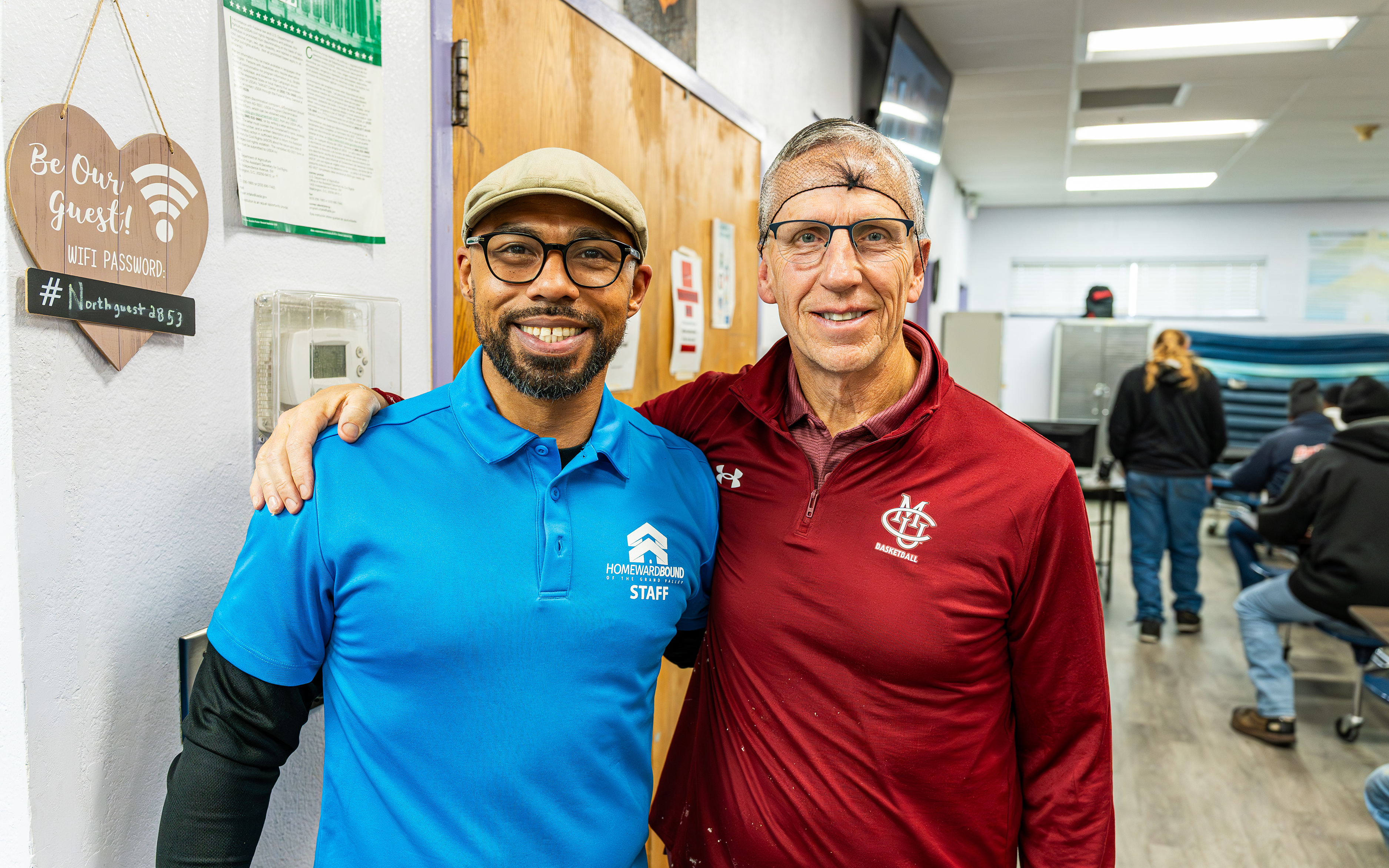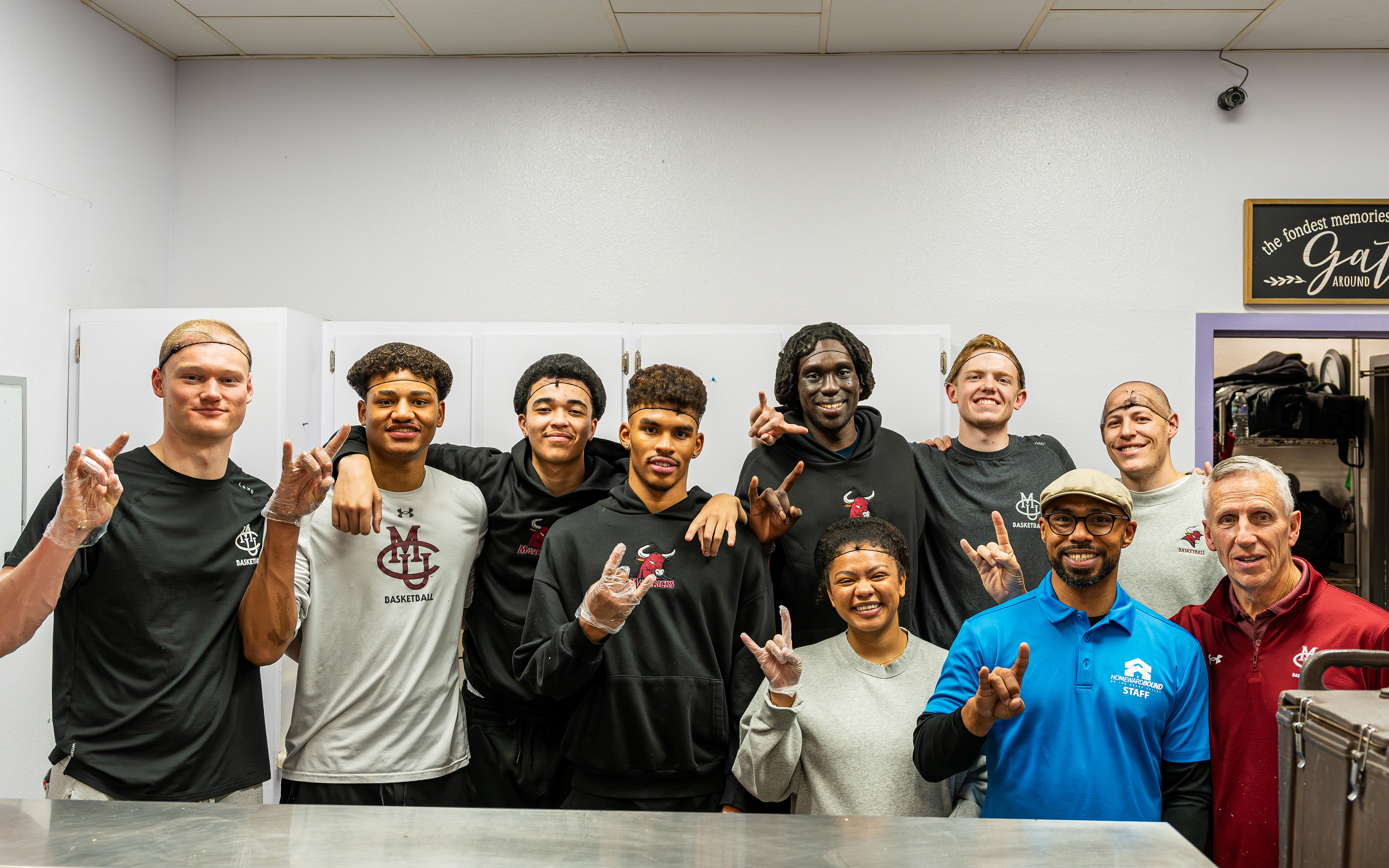 Organized by CMU assistant men’s basketball coach Sean Evans, the team — along with head coach Mike Dunlap and assistant coach Skyler Burgess — arrived at HomewardBound on Sunday, having played Emporia State University late the night before, to serve breakfast to those in the community experiencing homelessness.