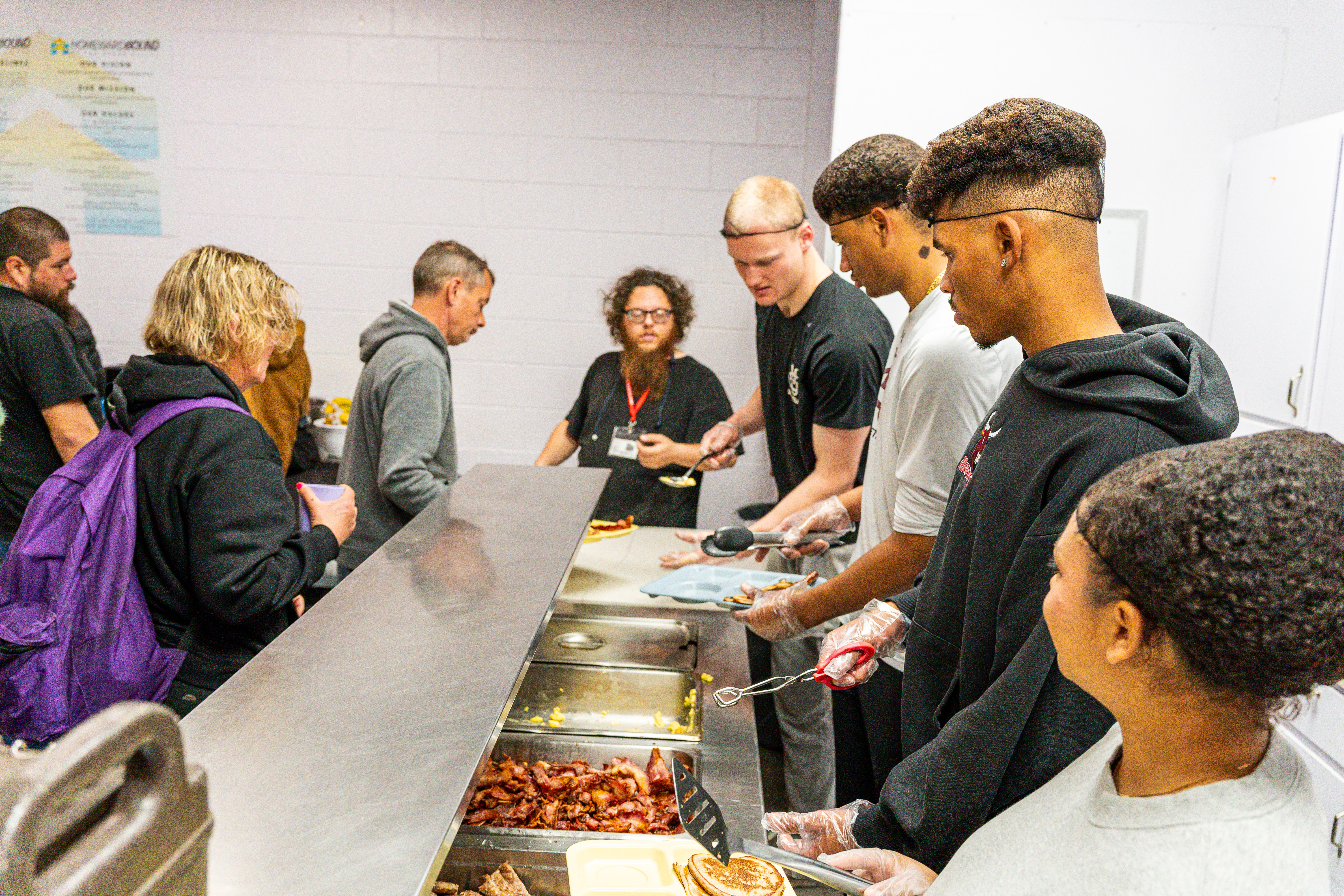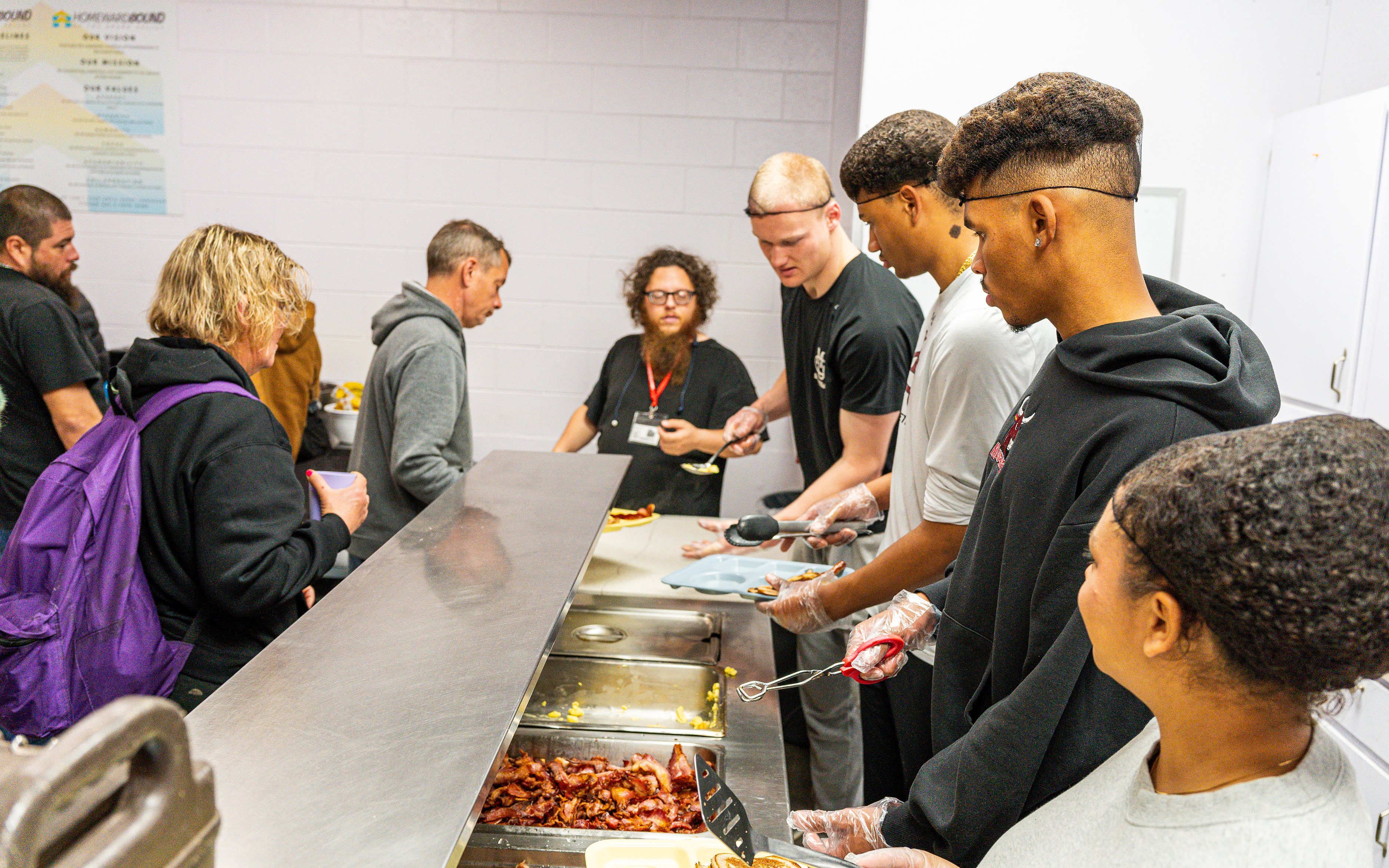 The initiative was led by Assistant Coach Sean Evans with the support of Head Coach Mike Dunlap and Assistant Coach Skyler Burgess. The holiday spirit was felt throughout the building as the team took time to connect with the guests as they shared their stories and opened up about their current circumstances. After the meal, they also stayed to help the HomewardBound staff clean up.
